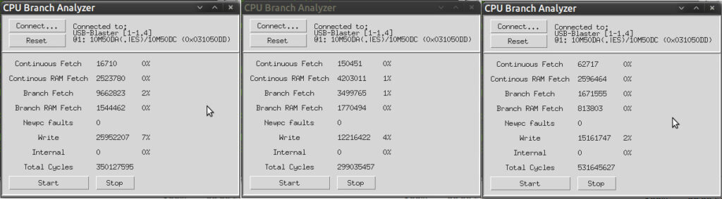 As expected, continuous fetching is as close to optimal as makes no difference – the remaining delays will be from situations where the cache is busy filling a cacheline from SDRAM and can’t respond to a fetch until that’s done – but the numbers are so small as to be lost in the noise, so this isn’t worth worrying about.